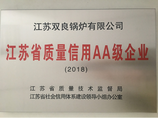 2019年3月18日,江蘇雙良鍋爐有限公司榮獲江蘇省質(zhì)量技術監(jiān)督局頒發(fā)的“江蘇省質(zhì)量信用AA級企業(yè)”稱號。