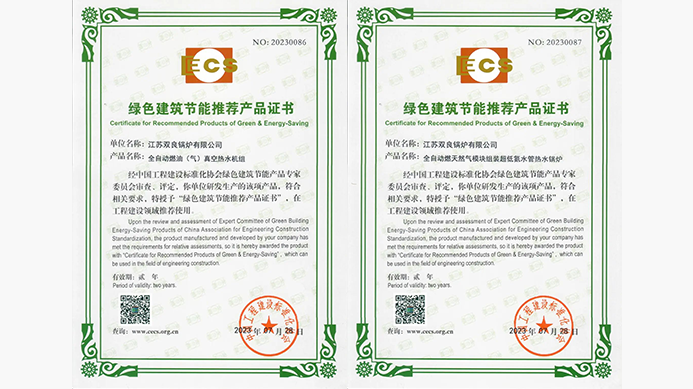 近日,經(jīng)中國工程建設(shè)標(biāo)準(zhǔn)化協(xié)會(huì)綠色建筑節(jié)能產(chǎn)品專家委員會(huì)審查、評(píng)定,江蘇雙良鍋爐有限公司(簡稱“雙良鍋爐”)研發(fā)生產(chǎn)的全自動(dòng)燃油(氣)真空熱水機(jī)組、全自動(dòng)燃天然氣模塊組裝超低氮水管熱水鍋爐,符合相關(guān)要求,再度被授予“綠色建筑節(jié)能推薦產(chǎn)品證書”,在工程建設(shè)領(lǐng)域推薦使用。